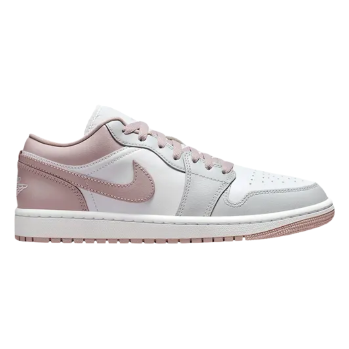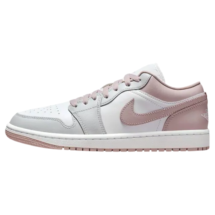 The women's Air Jordan 1 Low 'Particle Rose' blends feminine elegance with iconic low-top heritage. Crisp white leather base contrasts beautifully with premium particle rose overlays on the forefoot, eyelets, and heel for sophisticated warmth. Classic Wings logo, Jumpman tongue label, and Nike Swoosh shine in matching rose tones. Encapsulated Air-Sole heel unit delivers lightweight cushioning atop a durable rubber outsole with pivot circle for versatile street style.