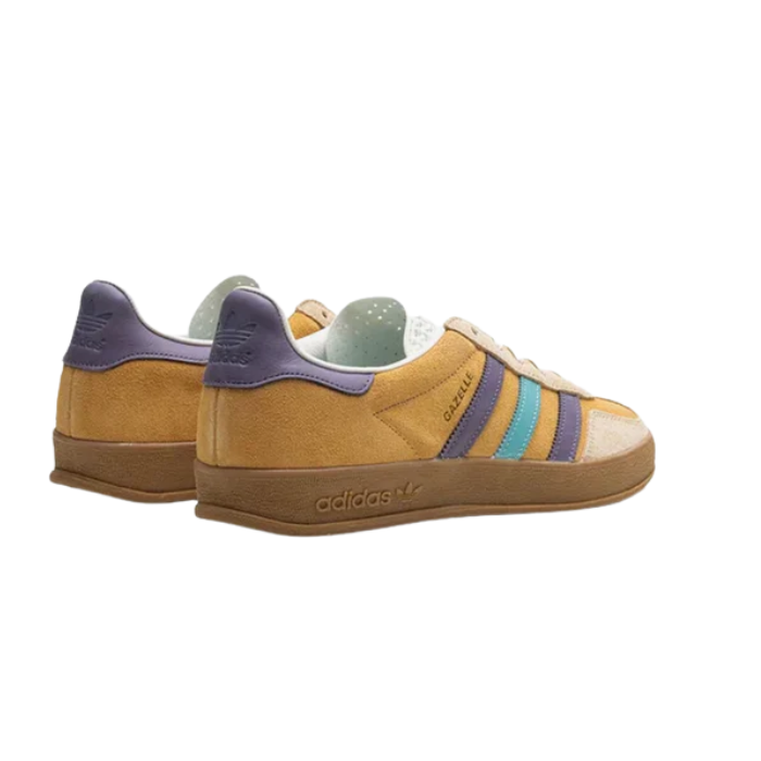 adidas Gazelle Indoor 'Glow Orange Shadow Violet' is a contemporary reissue of the classic 1979 Gazelle Indoor, blending vintage design with modern aesthetics. The sneaker features a premium glow orange suede upper, complemented by shadow violet accents on the 3-Stripes and heel tab, creating a vibrant yet balanced color scheme. A durable leather lining ensures comfort, while the natural rubber outsole offers reliable traction and a transparent look that enhances the shoe's retro appeal. Additional details include gold-foil "Gazelle" branding on the lateral side and a Trefoil logo on the tongue, emphasizing its heritage.