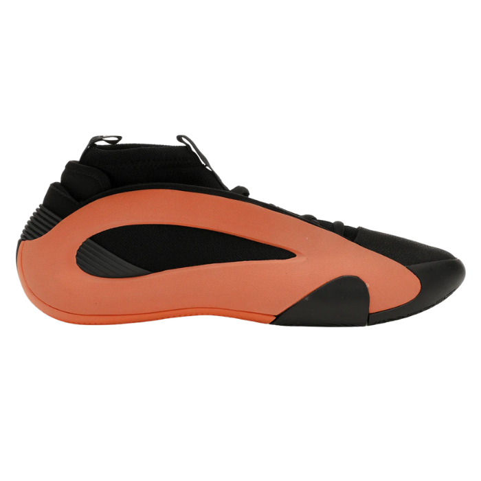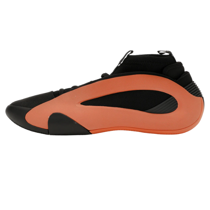 The Adidas Harden Vol. 8 Sculpt features a black and light orange color-blocked design with a sock-style ankle and slip-on construction for ease and snug fit. It incorporates teardrop-shaped EVA panels for support and protection, combined with a chunky rubber sole for traction and durability, blending style with performance.
