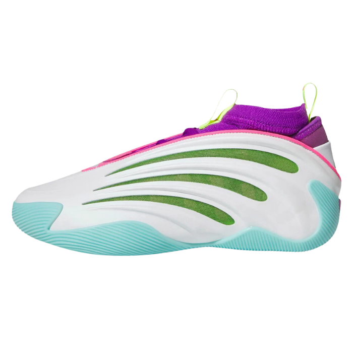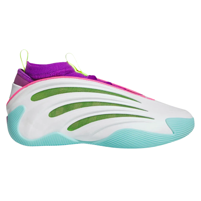 The Adidas Harden Vol. 9 Jalen Williams White Lucid Lime Pink features a sleek white synthetic leather upper with bold Lucid Lime mesh cutouts and hot pink piping accents. A snug purple neoprene bootie and icy blue outsole provide comfort and style. BOOST and Lightstrike cushioning ensure energy return, while custom Jalen Williams branding adds a personal touch.