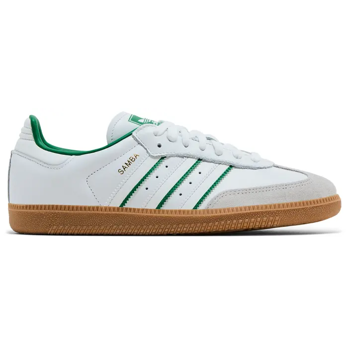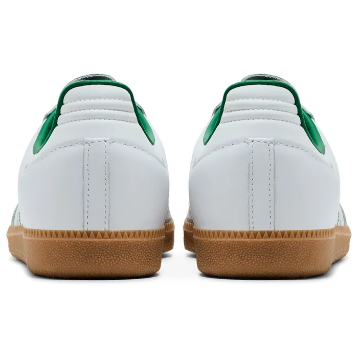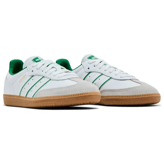 The standout element here is the vibrant green detailing—seen on the serrated 3-Stripes, heel tab, and woven tongue label—bringing a fresh pop of color that contrasts beautifully with the minimalist base. The gold foil “SAMBA” branding on the lateral side adds a touch of legacy, while the gum rubber outsole delivers excellent grip and durability with that signature retro look. The low-profile silhouette hugs the foot comfortably, making it as functional as it is stylish. Whether you're styling it with track pants, cargos, or jeans, the Samba OG White Green is a go-to for effortless versatility.