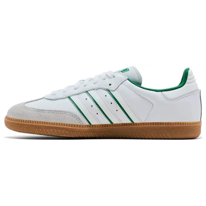 Classic, crisp, and rooted in sport—this adidas Samba OG White Green Gum is a tribute to timeless design and athletic heritage. First introduced as an indoor soccer shoe, the Samba has become a cultural icon worn by footballers, skaters, and streetwear enthusiasts alike, and this colorway captures its essence with clean lines and bold accents. The upper is built from smooth white leather, complemented by a light grey suede T-toe overlay that adds both structure and vintage flair.