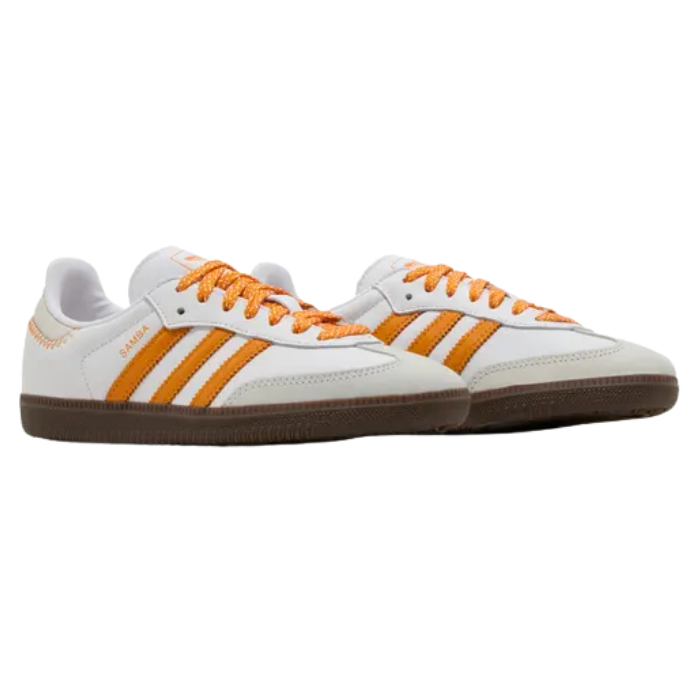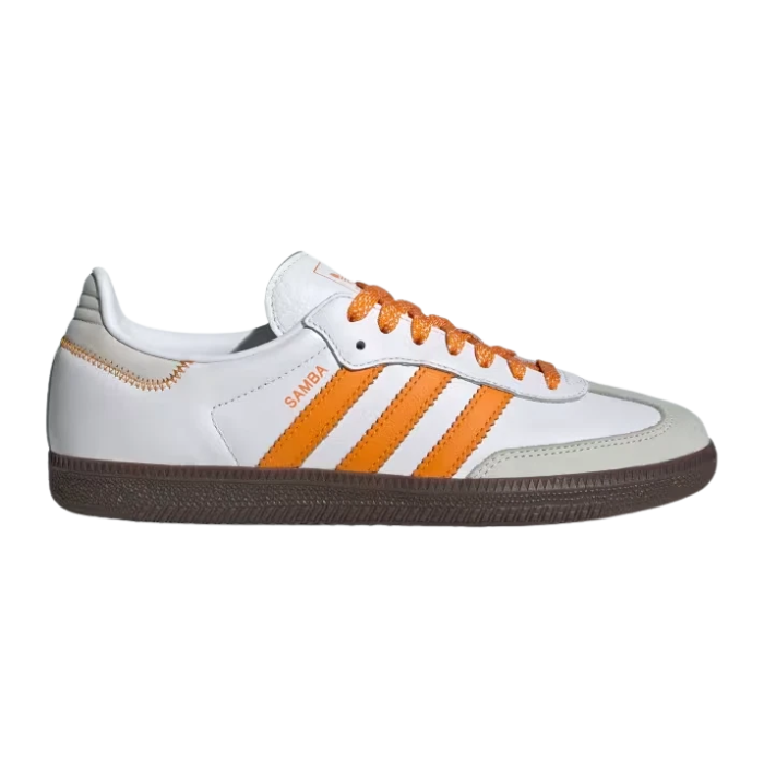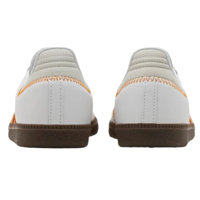 The Adidas Samba OG Cloud White Orange features a smooth cloud white leather upper accented with clear orange overlays and semi-coral suede on the toe for durability and style. It sits on a classic gum rubber sole, blending timeless design with vibrant color for modern appeal.