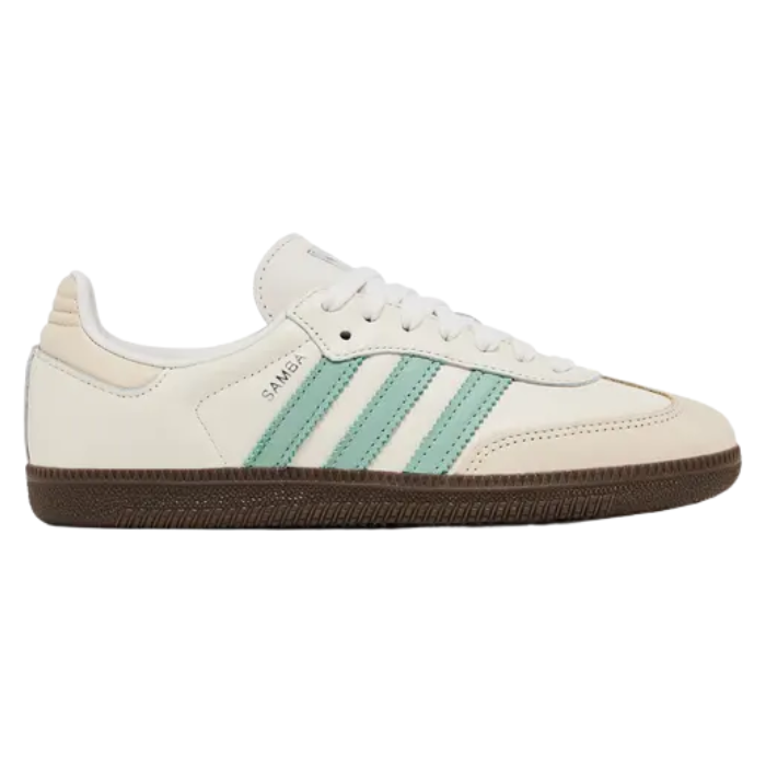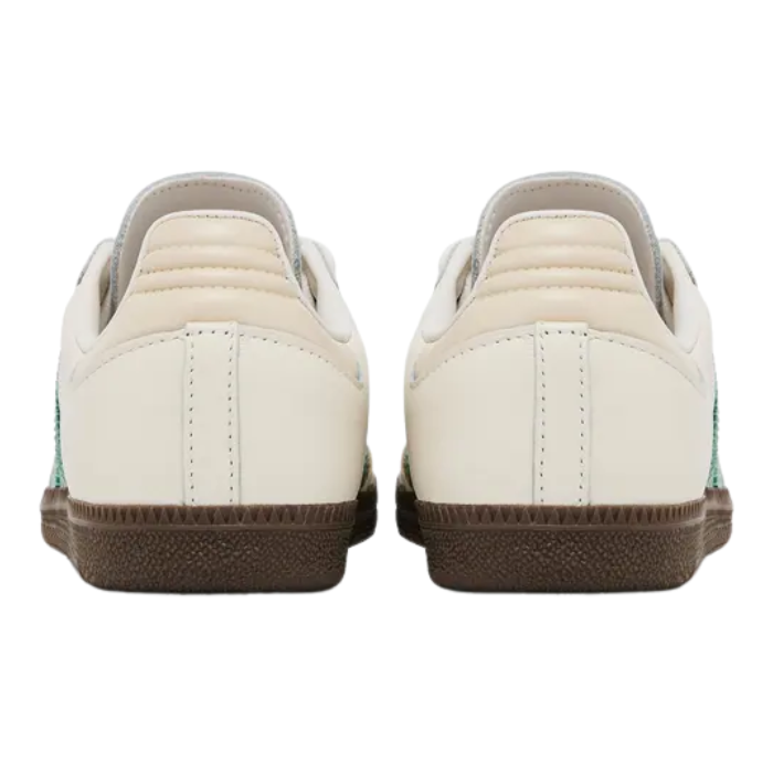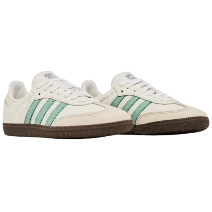 The Adidas Samba OG Hazy Green features a premium mesh-like leather upper with smooth texture and nubuck overlays for durability and style. Classic T-toe, stitched heel tab, and gum rubber outsole offer authentic Samba details. Its fresh, seasonal green tint pairs well with casual or streetwear looks.