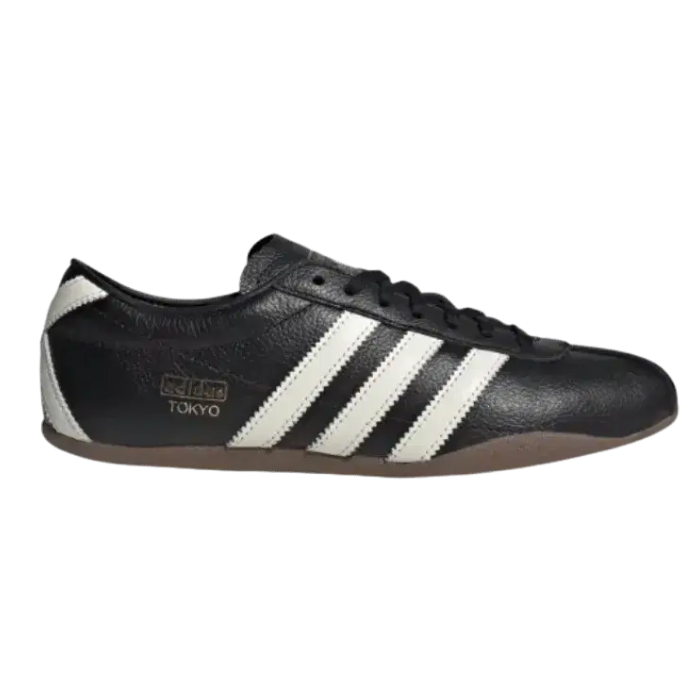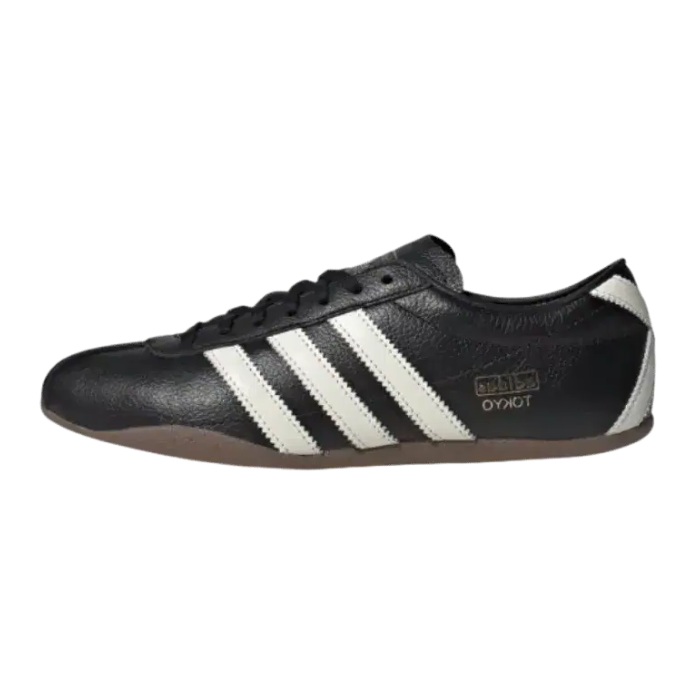 The Adidas Tokyo Core Black showcases a slim, low-profile silhouette inspired by 70s running shoes. It features a soft core black suede upper, white leather serrated 3-Stripes, gold logo accents, and a gum rubber outsole. Lace closure and leather lining add comfort and vintage-modern street appeal.