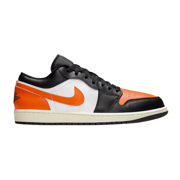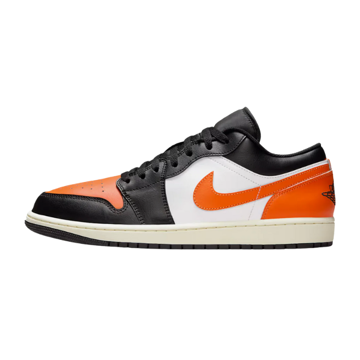 The Air Jordan 1 Low “Alternate Shattered Backboard” features a premium leather upper in black, white, and starfish orange. It retains the classic Jordan color blocking with a black Swoosh, orange toe and heel, and white mid-panel. A white midsole and orange outsole complete this bold heritage-inspired look