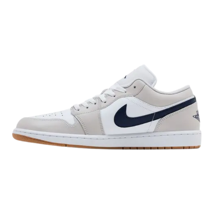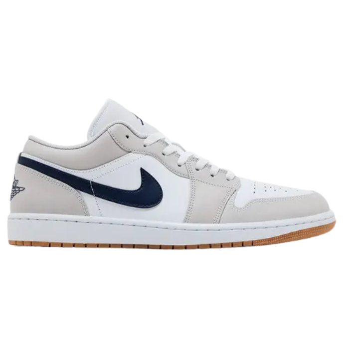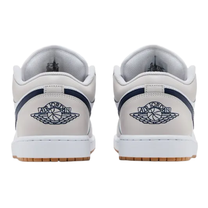 The Air Jordan 1 Low 'Georgetown' arrives in a familiar palette inspired by the Hoyas. The low-top sports a white leather upper with suede overlays in a light grey finish. The signature Swoosh is rendered in Midnight Navy, matching the Jumpman icon atop the tongue and the Wings logo embroidered on the back heel. The sneaker rides on a durable cupsole, highlighted by crisp white sidewalls and a grippy gum rubber outsole.