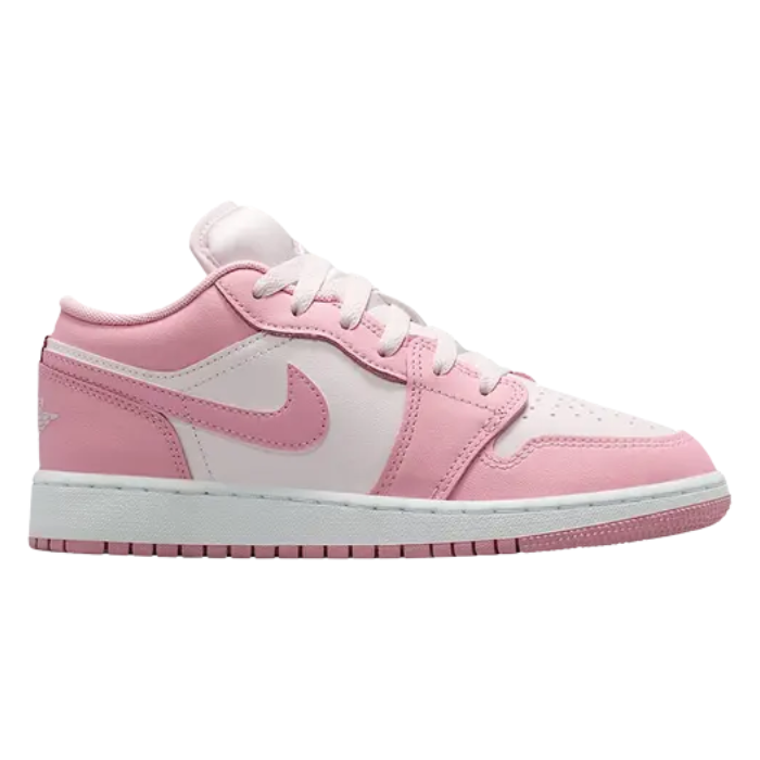 The Air Jordan 1 Low GS 'Medium Soft Pink White' brings playful femininity to the iconic low-top basketball silhouette designed for grade school sizing. Premium medium soft pink leather constructs the upper with smooth white accents on the winged Jumpman logo, Swoosh, and collar for crisp contrast. A padded ankle collar ensures comfort, while the Nike Air unit in the heel delivers lightweight cushioning. Flex grooves enhance forefoot flexibility, and the solid rubber outsole provides reliable traction on streets and courts