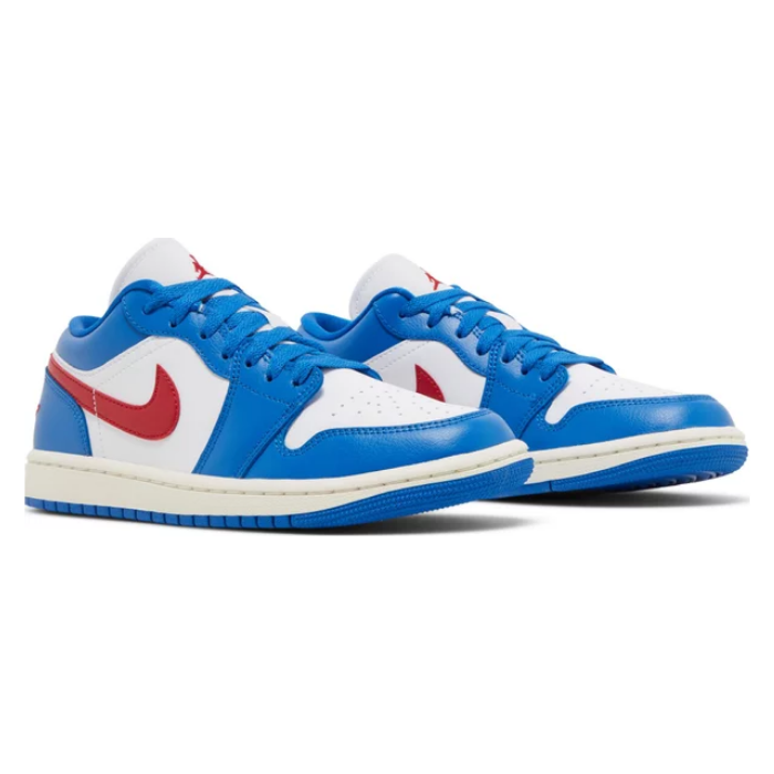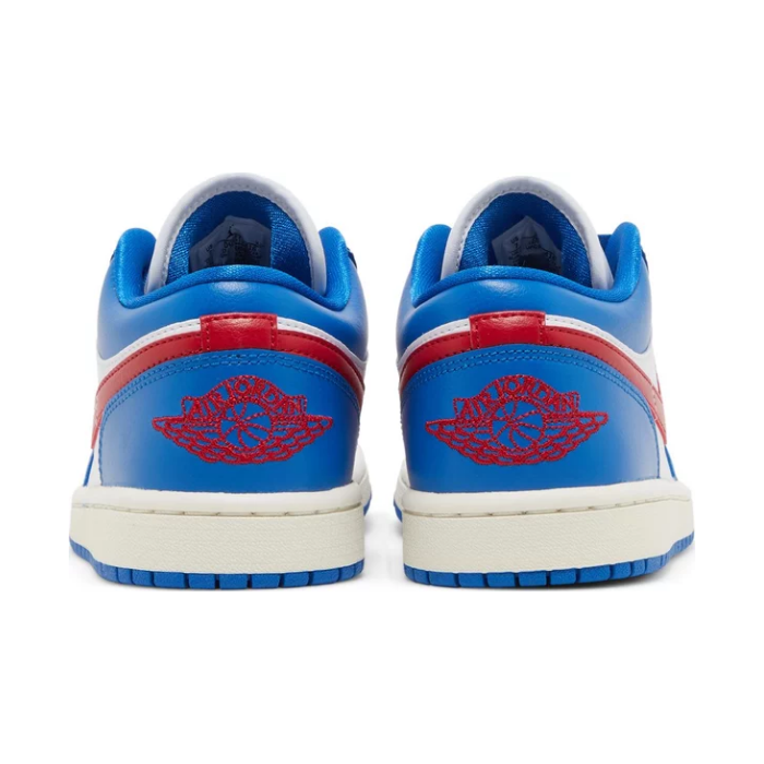 Dressed in a Sport Blue, Gym Red, White, and Sail color scheme. This offering of the Air Jordan 1 Low comes constructed in a full leather build with mesh tongues and lining. A two-tone rubber outsole completes the design.