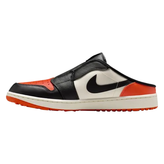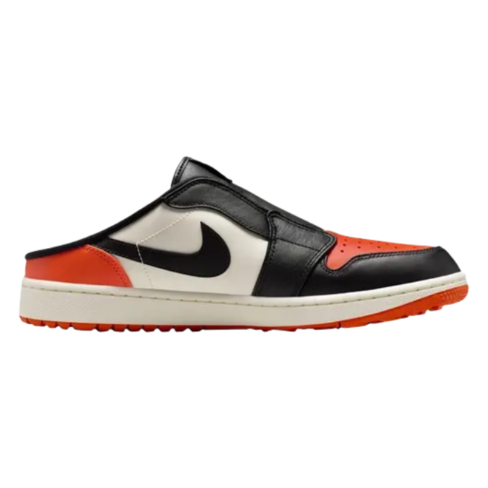 The Air Jordan 1 Mule Golf 'Shattered Backboard' reimagines a legendary colorway for the golf course in a slip-on mule silhouette. It features premium black, sail white, and starfish orange leather inspired by Michael Jordan’s iconic backboard-shattering dunk. The backless design offers casual clubhouse versatility, while a spikeless golf-ready outsole ensures grip and style, merging leisurewear with court heritage in a bold, functional package.