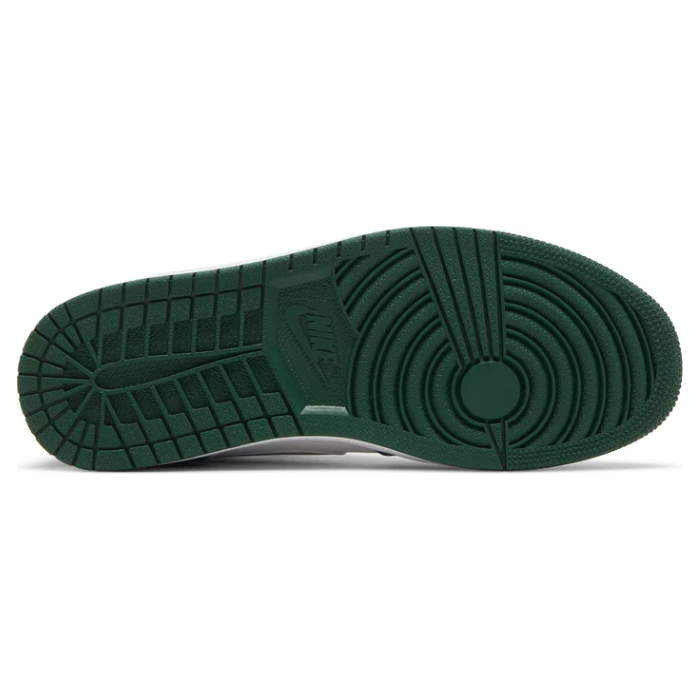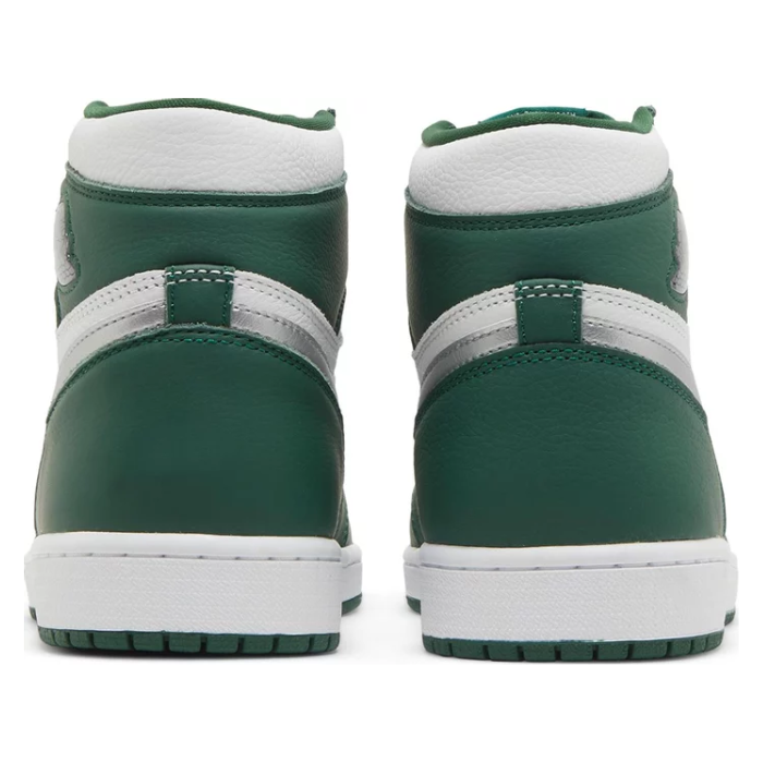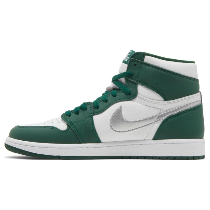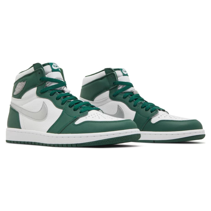 The Air Jordan 1 Retro High OG ‘Gorge Green’ features color blocking reminiscent of the iconic Air Jordan 1 CO.JP ‘Midnight Navy,’ originally released in 2001 and reissued in 2020. The high-top carries a tumbled leather upper that pairs a white base with forest green overlays at the forefoot and heel. Branding elements include a metallic silver Swoosh and a jeweled Wings logo on the lateral collar flap. Underpinning the sneaker is a rubber cupsole, highlighted by encapsulated Air-sole cushioning and a green rubber outsole.
