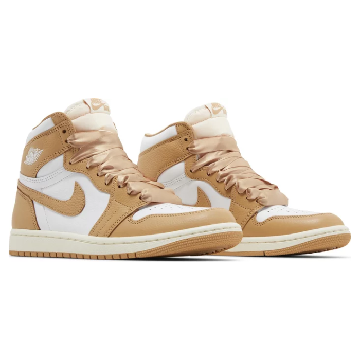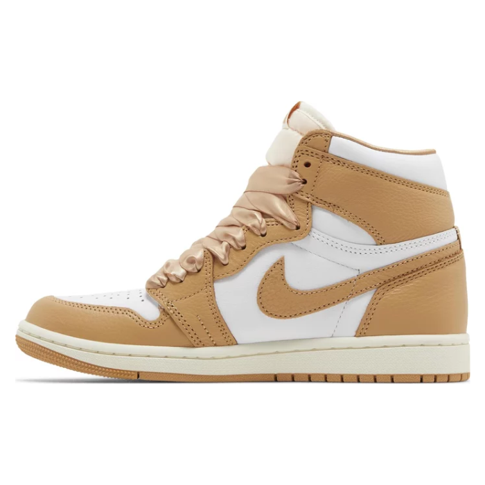 The Air Jordan 1 Retro High OG ‘Praline’ makes over the iconic silhouette with neutral hues that complement the shoe’s timeless lines. The all-leather upper combines a white base with contrasting tan overlays and a color-matched Swoosh. A woven Nike Air tag adorns the lightly padded nylon tongue, while the Jordan Wings logo is stamped on the lateral collar flap. The sneaker is mounted on a traditional cupsole, featuring textured white sidewalls and a grippy tan rubber outsole.