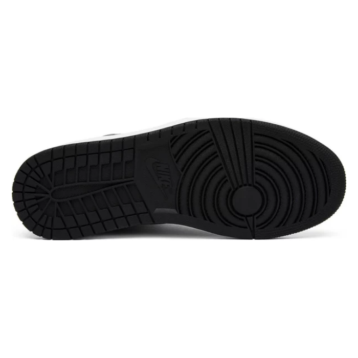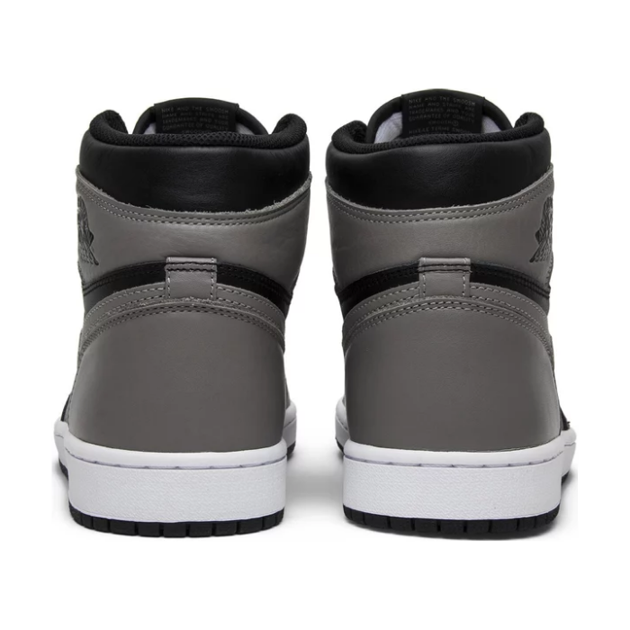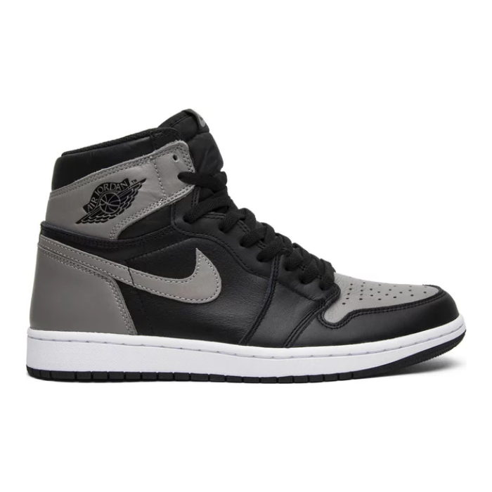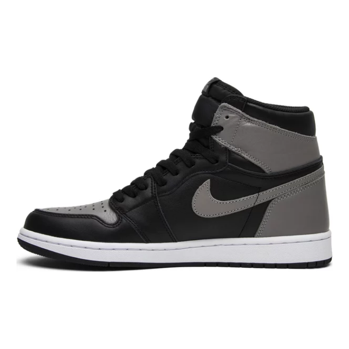This Nike Air Jordan 1 Retro High OG 'Shadow' is a retro re-release of an original 1985 colorway. The shoe features a black and medium grey leather upper with a white midsole and black outsole. It also features OG Nike Air branding on the tongue and the Wings logo on the ankle collar.