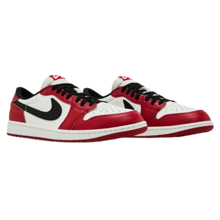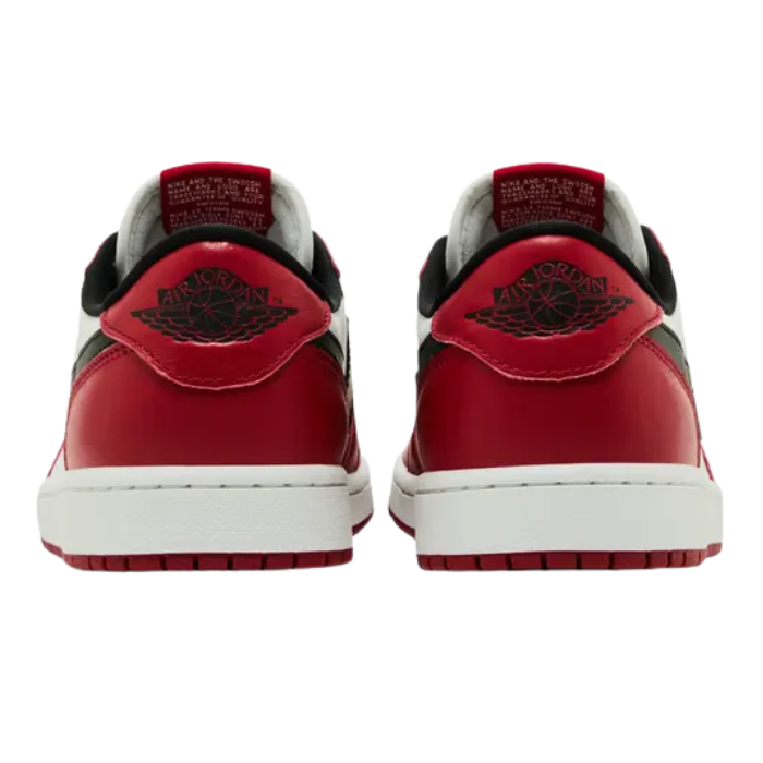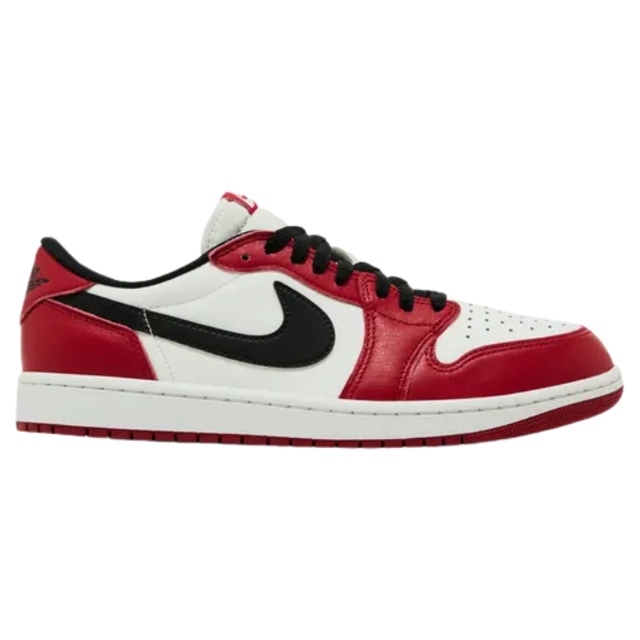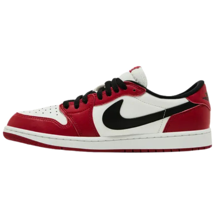 The Air Jordan 1 Retro Low OG 'Chicago' 2025 revives an iconic look with premium Varsity Red and Summit White leather, complemented by bold black Swooshes and laces. Classic details include a debossed Wings logo on the heel, perforated toe box, and crisp nylon tongue with retro Nike Air branding. Enhanced fit and slightly wider toe box channel heritage, while the red rubber outsole completes its timeless and energetic appeal.