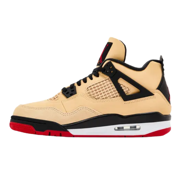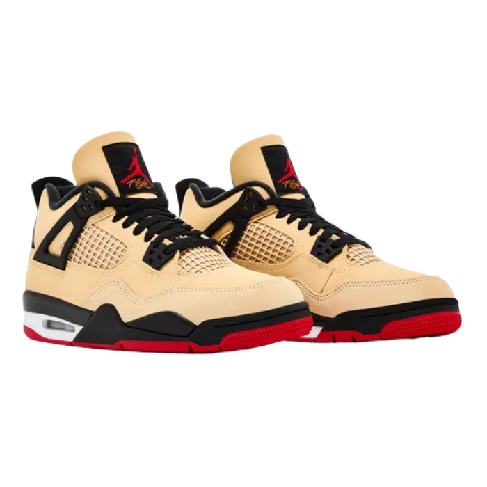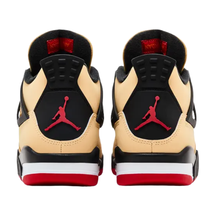 The Air Jordan 4 Retro GS 'Pizza' delivers playful food-inspired style for kids, featuring a tan suede and leather upper echoing pizza crust, black accents representing oven char, and red on the outsole and Jumpman logo for marinara sauce. It includes a checkered tablecloth insole, pizza box packaging, and rugged construction with mesh panels and Air cushioning. Two-tone leathers and a bold theme create standout flair.