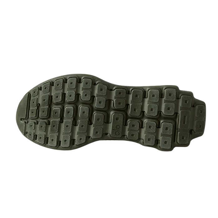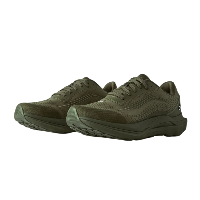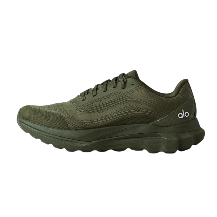 The ALO Runner "Green Olive" sneaker offers stability and support with a breathable double-layer mesh upper made from recycled materials. It features a stabilizing heel clip, dynamic dual-density midsole for cushioning, multi-terrain outsole grip pods, and reflective details, providing traction and comfort for diverse activities.