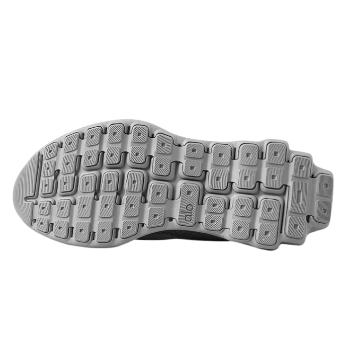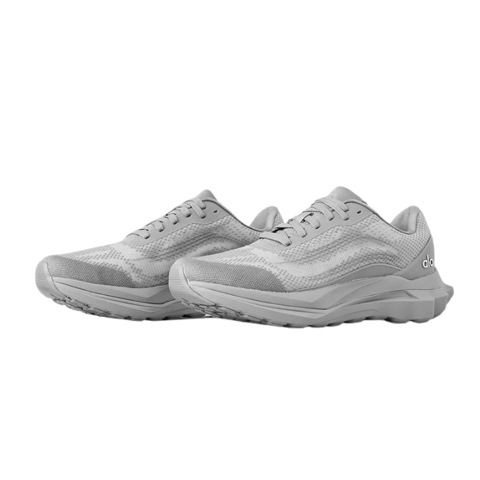 The ALO Runner "Grey" sneaker features a breathable double-layer mesh upper, stabilizing heel clip, and dynamic dual-density midsole for cushioning and support. Its multi-terrain outsole grip pods provide traction across surfaces. Lightweight with reflective details, it offers versatile style and comfort for running, walking, and gym workouts.