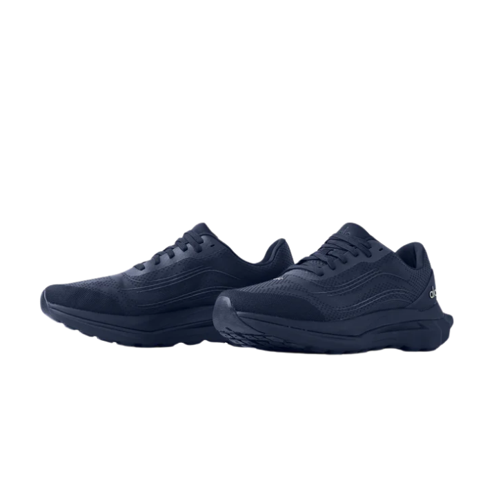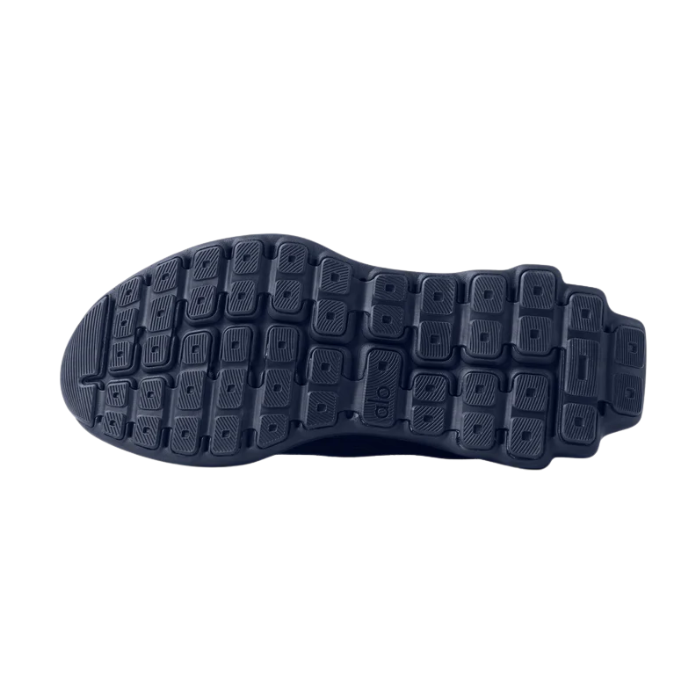 The ALO Runner "Navy" sneaker features a breathable double-layer mesh upper made with 70% recycled materials, a stabilizing heel clip, and dynamic dual-density midsole for soft impact and responsive comfort. Its multi-terrain grip outsole and reflective accents provide traction and visibility, making it versatile for varied workouts and casual wear.