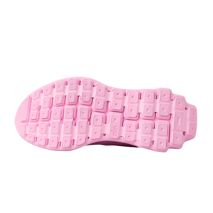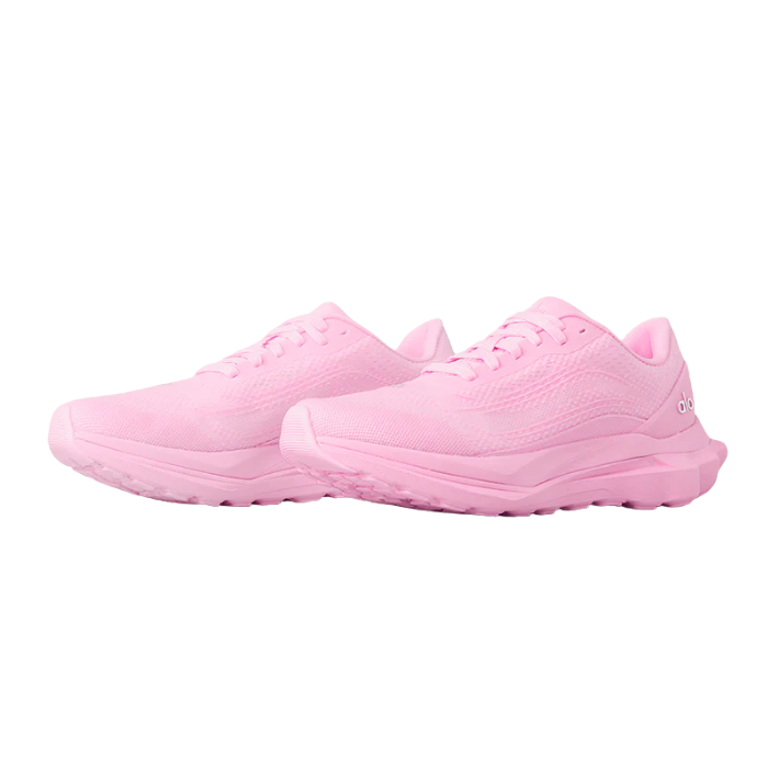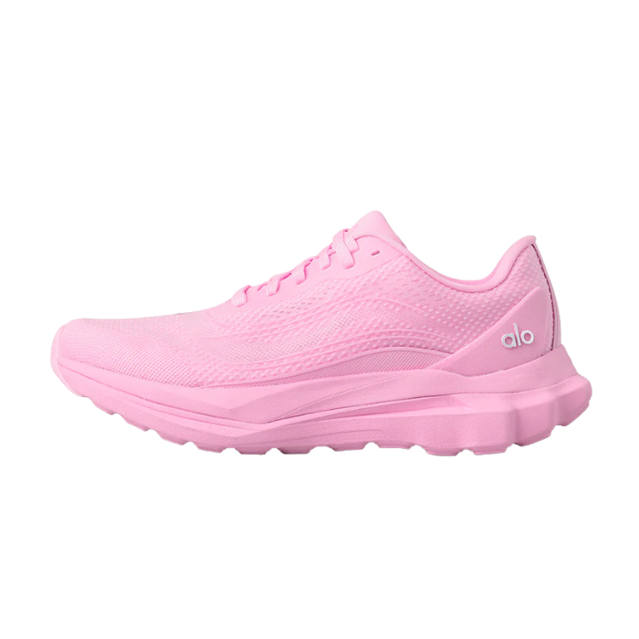The ALO Runner "Sweet Pink" sneaker features a breathable double-layer mesh upper crafted from 70% recycled materials, a stabilizing heel clip, and dynamic dual-density midsole for responsive cushioning. Extra-firm heel cushioning and multi-terrain grip pods provide comfort and traction, making it ideal for versatile workouts and casual wear.