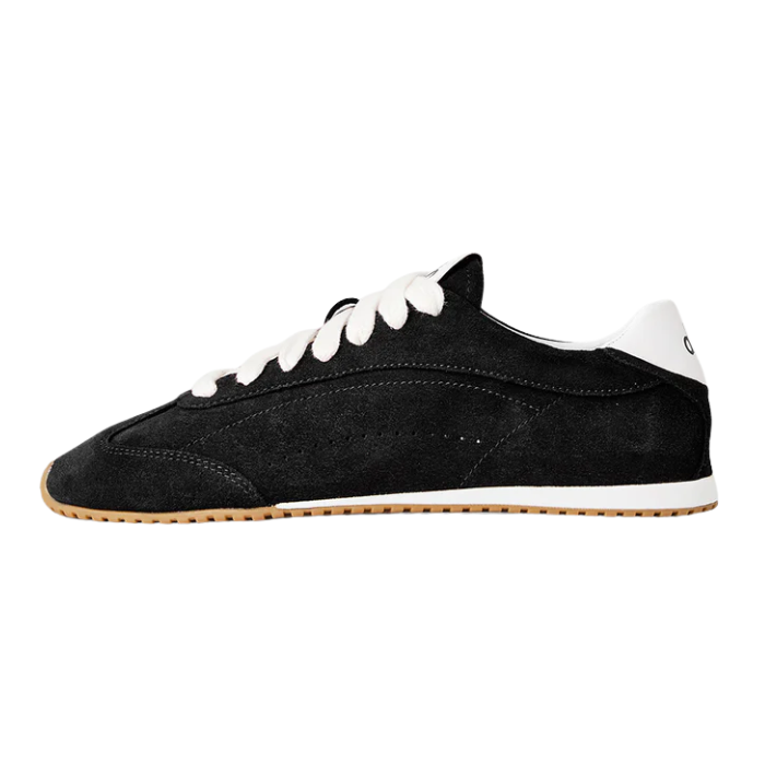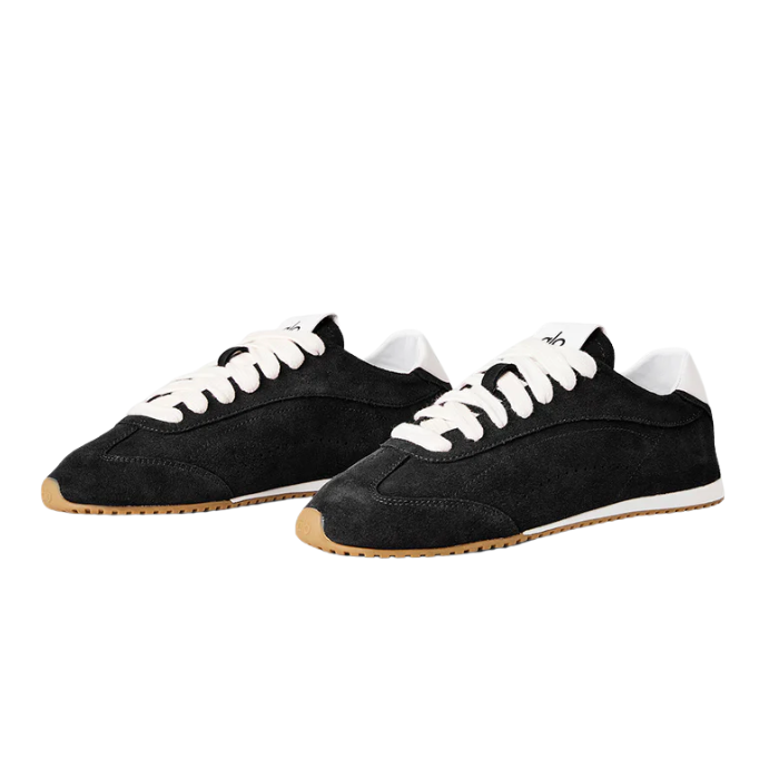 The ALO Sunset "Black" sneaker embodies LA-inspired minimalism, featuring a plush suede upper, streamlined low-profile silhouette, and extra-wide laces. Enhanced with a padded collar and cushioned recovery foam insole, it delivers all-day comfort and versatile, elevated street style for seamless transitions from studio sessions to city life.