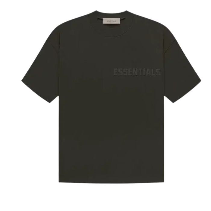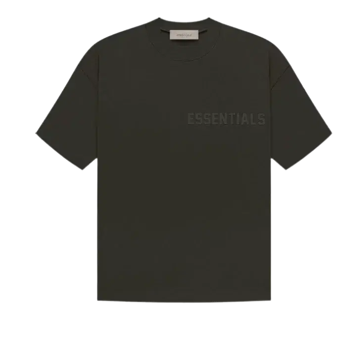 The Essentials SS23 'Off Black Tee' features a soft cotton blend with a relaxed, oversized fit for effortless style and comfort. It showcases a subtle tonal velvet flocking Essentials logo on the chest, inspired by vintage sportswear. Dropped shoulders and a rib-knit crewneck complete this versatile streetwear staple, perfect for layering or standalone wear.