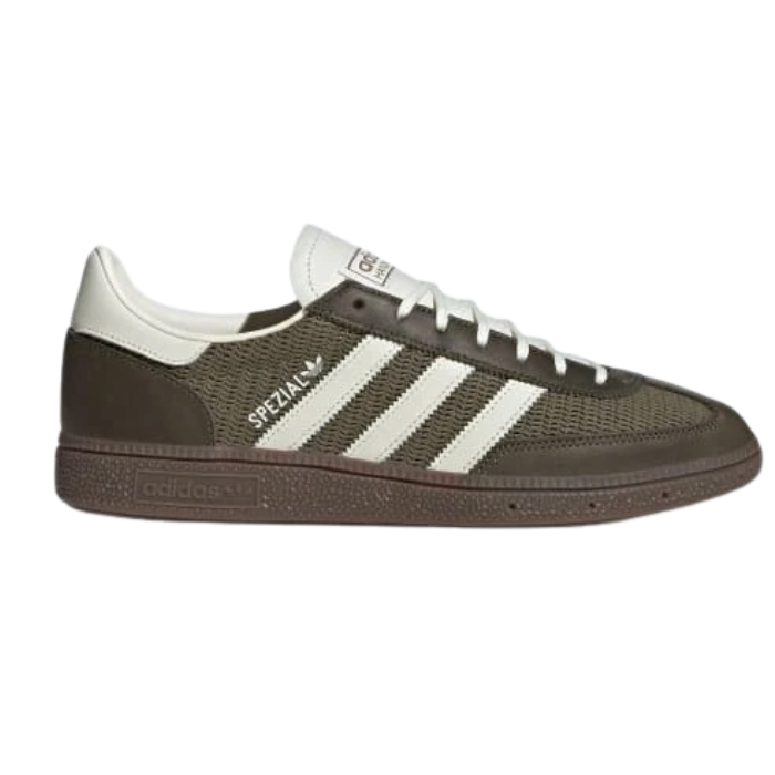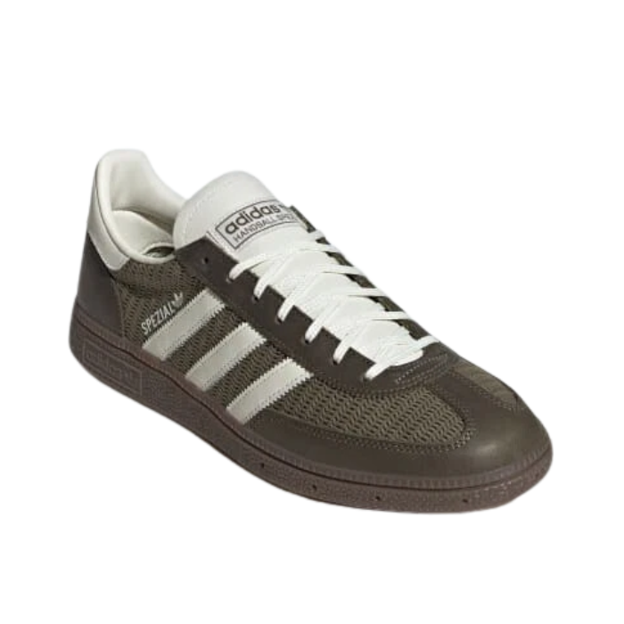 The Adidas Handball Spezial 'Focus Olive Ivory' features a premium blend of olive green and ivory leather and suede uppers, offering a sophisticated, vintage-inspired look. It has a durable rubber outsole for excellent traction and comfort, making it ideal for both casual wear and daily adventures with timeless style.