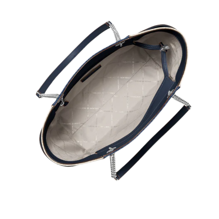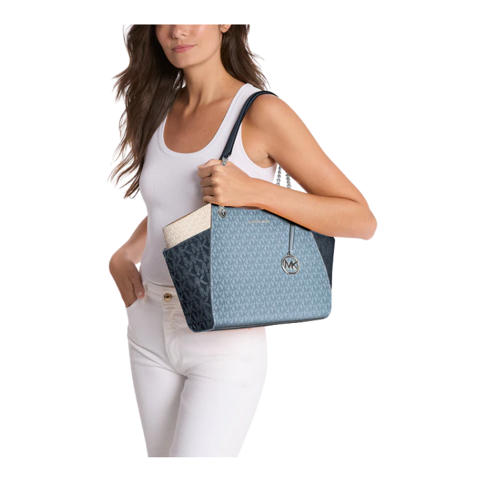 The Michael Kors Jet Set Large Color-Block Signature Logo Shoulder Bag in admiral multi showcases vibrant logo-print coated canvas (89.4% coated canvas/9.6% polyester/1% polyurethane) accented with smooth leather trim and gold-tone chain hardware for stylish appeal. Measuring 12.5"W x 9.25"H x 5.75"D with adjustable shoulder strap, it features magnetic snap closure, front slip pocket, interior zip and slip pockets, plus polyester lining for organized everyday carry.