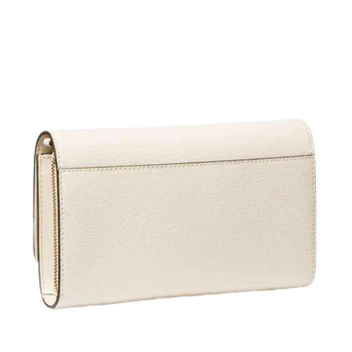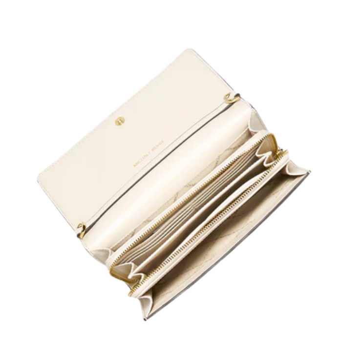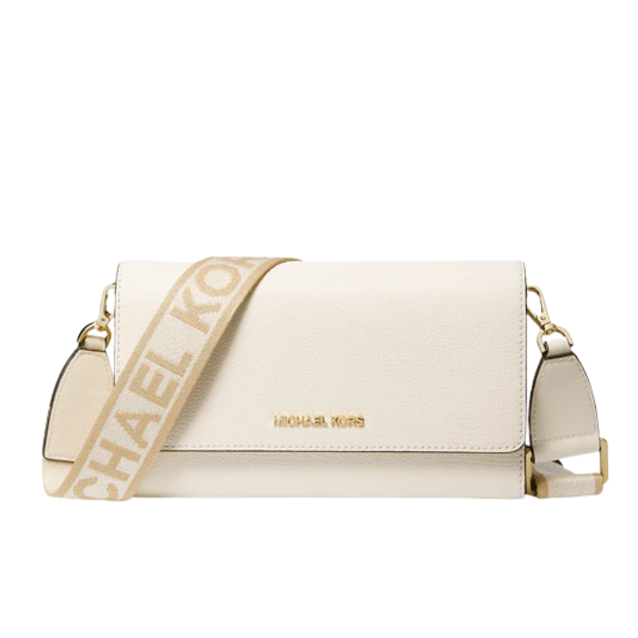 The Michael Kors Jet Set Large Leather Crossbody Bag in light cream showcases premium saffiano leather (100% leather) with gold-tone hardware for a sleek, luxurious finish. Measuring 8.5"W x 5.75"H x 3"D with adjustable strap (12.5"-25" drop), it features a back slip pocket exterior, interior back zip pocket, snap closure, and polyester lining—ideal for everyday essentials like phone, cards, and keys.