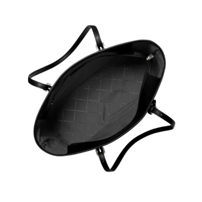The Michael Kors Jet Set Large Printed Signature Logo Tote Bag in black features logo-print coated canvas (90% coated canvas/10% polyester) with trim (60% polyurethane/20% cotton/20% polyester) and gold-tone hardware for bold everyday capacity. Measuring 17"W x 11.5"H x 6.25"D with 11" handle drop, it includes zip closure, interior back zip pocket, and 100% polyester lining—spacious design perfect for work, travel, or daily essentials.