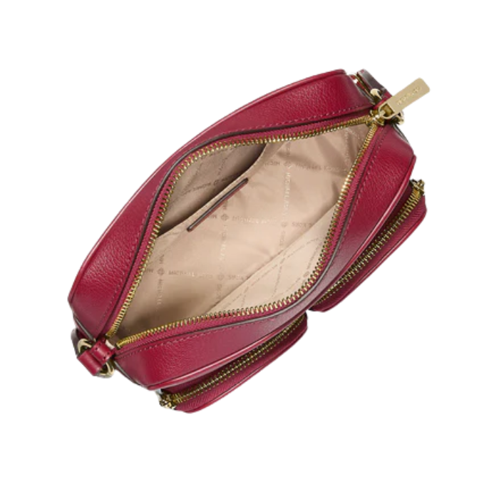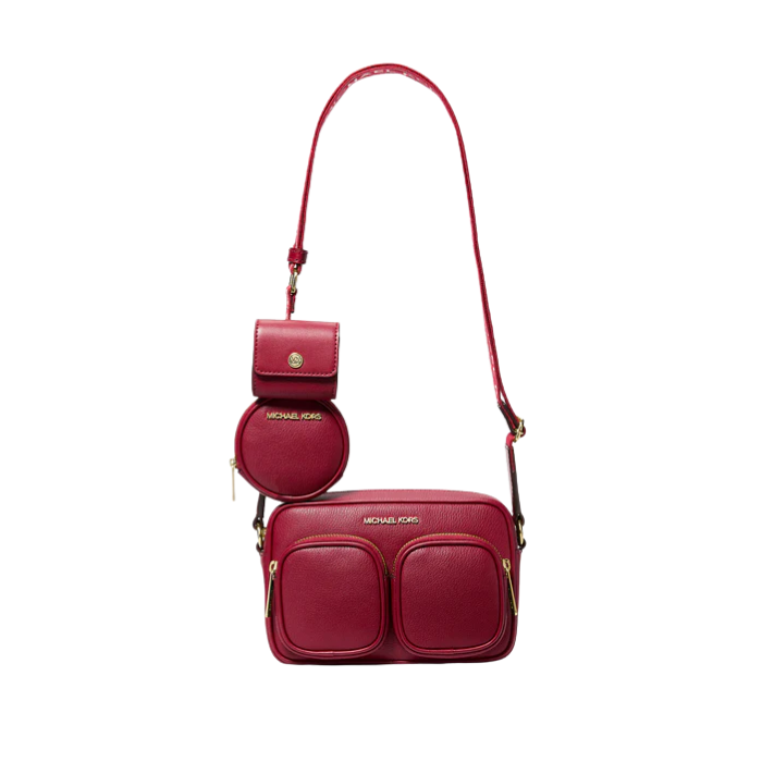 The Michael Kors Jet Set Travel Medium Leather Messenger Bag in vibrant cherry red is crafted from 100% premium leather with trim (60% polyurethane/20% cotton/20% polyester) and gold-tone hardware for bold sophistication. Measuring 8"W x 5"H x 2.75"D, it features back slip pocket exterior, two front zip pockets, interior back slip pocket, zip closure, adjustable strap, and 100% polyester lining—compact messenger style for daily essentials.
