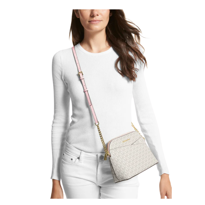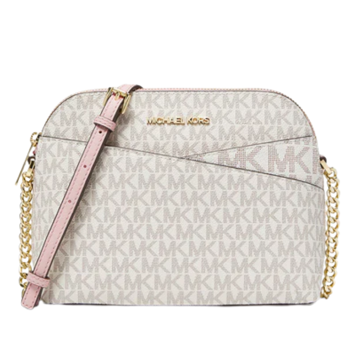 The Michael Kors Jet Set Travel Medium Logo Dome Crossbody Bag boasts signature logo-print coated canvas (89.4% coated canvas/9.6% polyester/1% polyurethane) with gold-tone hardware and topstitch detailing for a structured dome silhouette. Measuring 8.5"W x 6.75"H x 3.5"D, it features a back slip pocket exterior, interior back zip and front slip pockets, zip closure, adjustable chain-trimmed strap, and 100% polyester lining—perfect for on-the-go essentials.