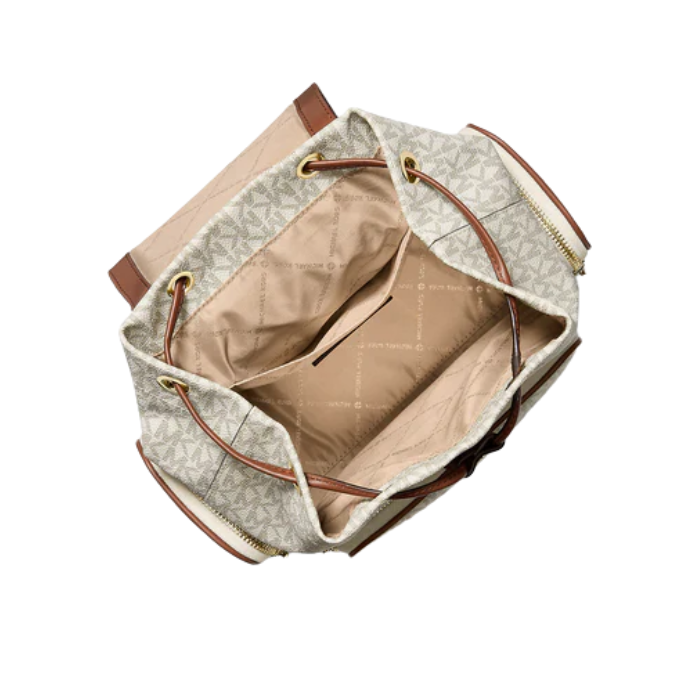 The Michael Kors Merritt Small Signature Logo Cargo Backpack in vanilla features logo-print coated canvas (89.4% coated canvas/9.6% polyester/1% polyurethane) with trim (60% polyurethane/40% polyester) and gold-tone hardware for chic utility. Measuring 8.5"W x 10.25"H x 4.75"D with adjustable backpack straps, it includes front zip pocket, 2 side zip pockets exterior, interior back zip pocket, top zip closure, and 100% polyester lining—perfect hands-free carry for urban essentials.