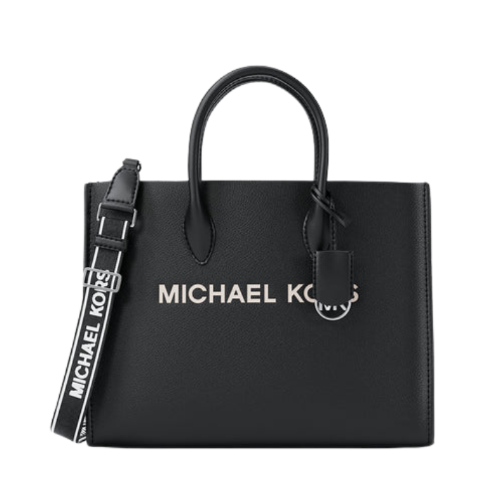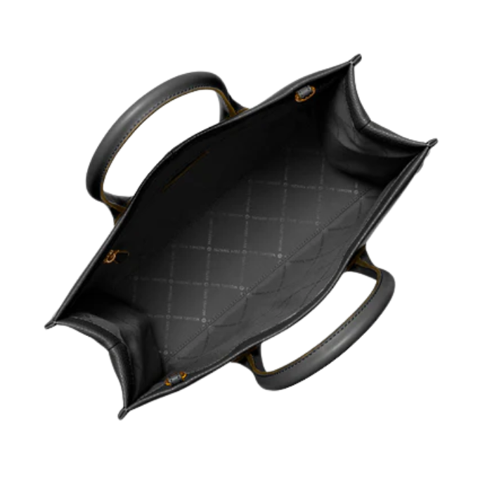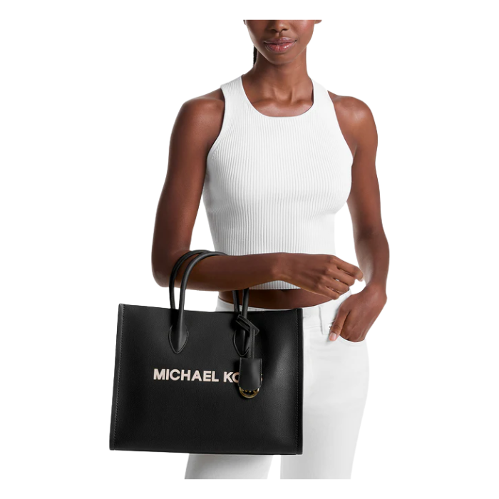 The Michael Kors Mirella Medium Pebbled Leather Tote Bag in black features textured pebbled leather with polished gold-tone hardware for a sophisticated, slouchy silhouette. Measuring approximately 13"W x 11"H x 5"D with 10" handle drop, it offers open-top design, dual rolled handles, front slip pocket, interior zip and slip pockets, removable pouch, and fabric lining—perfect for work or weekend essentials with versatile carry.