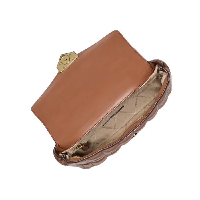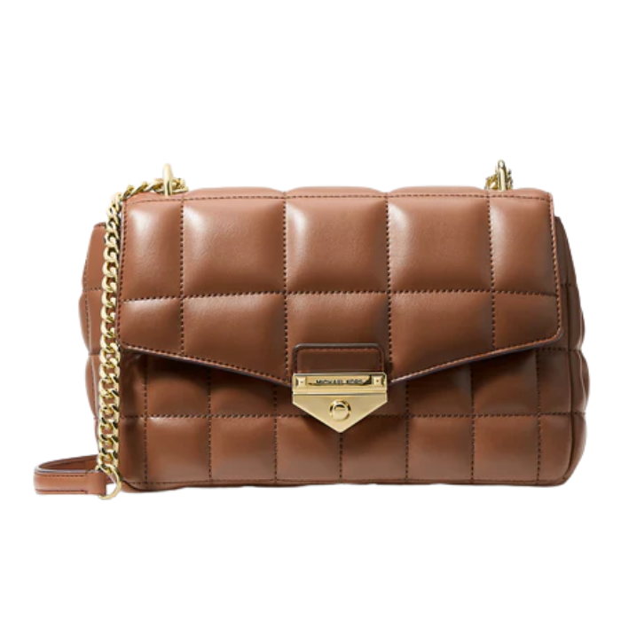The Michael Kors Soho Large Quilted Shoulder Bag features soft lamb leather with signature quilted stitching, gold-tone hardware, and push-lock closure for upscale NYC-inspired style. Measuring 9.75"W x 6.5"H x 3.5"D with adjustable strap (12"-22" drop), it includes exterior back snap pocket, interior back zip pocket, center zip pocket, front slip pocket, and 100% polyester lining—ideal structured shoulder bag for essentials like wallet, phone, keys, and lipstick.