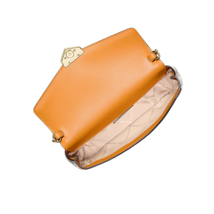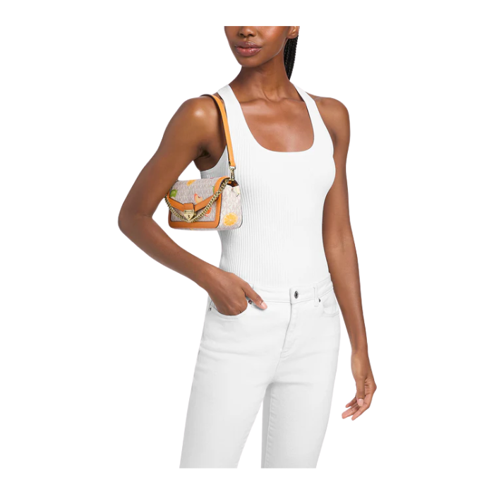 The Michael Kors Soho Small Printed Signature Logo Convertible Crossbody Bag features logo-print coated canvas (90% coated canvas/10% polyester) with trim (60% polyurethane/40% polyester) and gold-tone hardware for versatile urban style. Compact 8.5"W x 4.5"H x 2.5"D with 6.5" handle drop and adjustable strap (20.5"-24" drop), it includes back slip pocket, snap closure, and 100% polyester lining—ideal hands-free essential for daily outings.