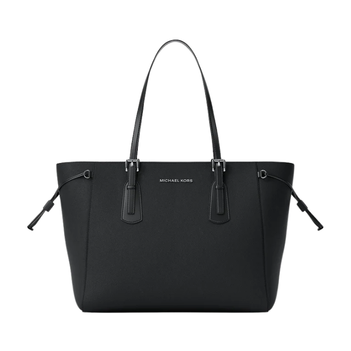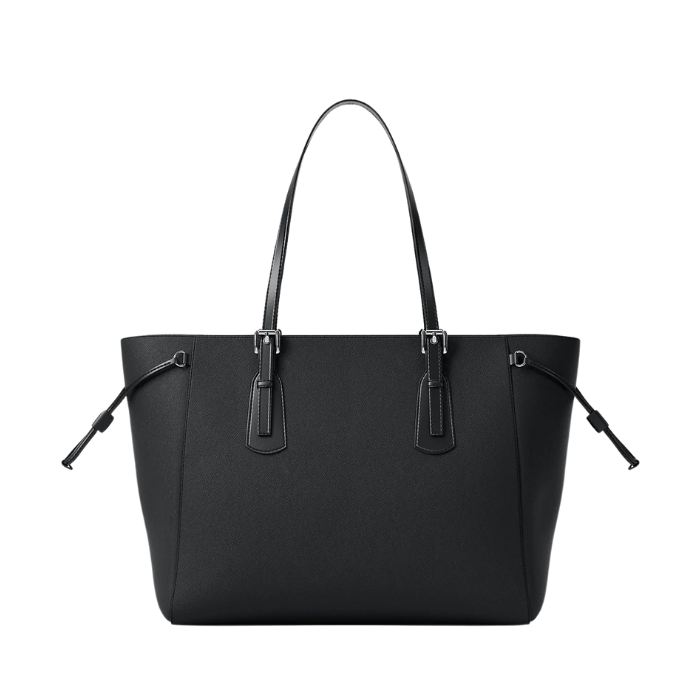 Tote bag Saffiano leather 100% leather Trim: 60% polyurethane/40% polyester Silver-tone hardware 17.25"W X 11"H X 6"D Handle drop: 11" Compatible with 14" laptop Interior details: back zip pocket, laptop snap pocket Lining: 100% polyester Zip fastening Dust bag not included Imported