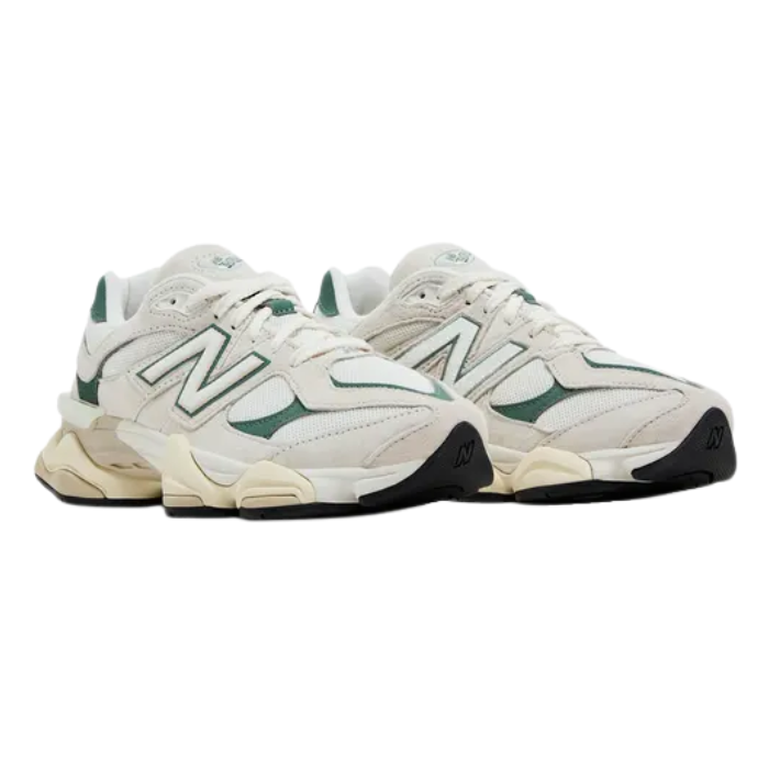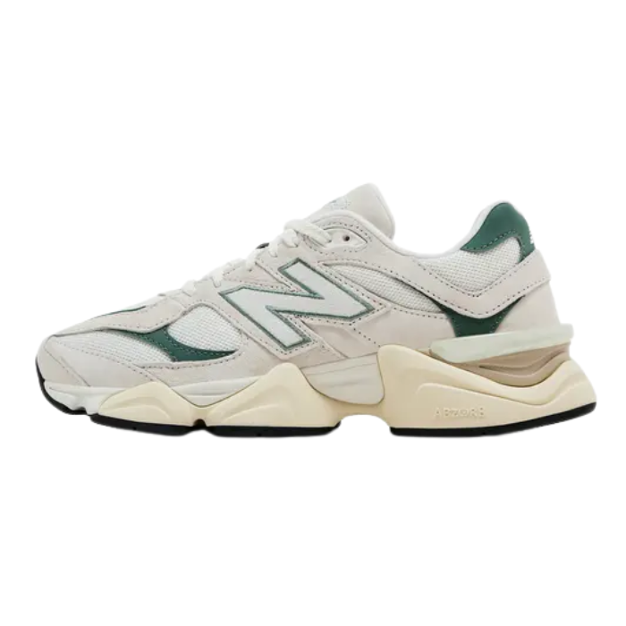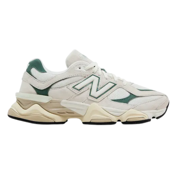 The New Balance 9060 'Linen Dark Juniper' redefines retro-futurism with a mesh and suede upper in soothing linen and rich dark juniper tones. Its exaggerated midsole features dual-density ABZORB and SBS cushioning for all-day support. Wavy sway bars, a diamond-patterned outsole, and a translucent CR heel add innovation, while reflective accents and robust construction make it ideal for versatile, stylish wear.