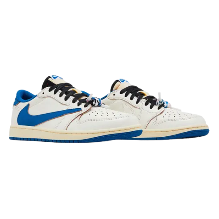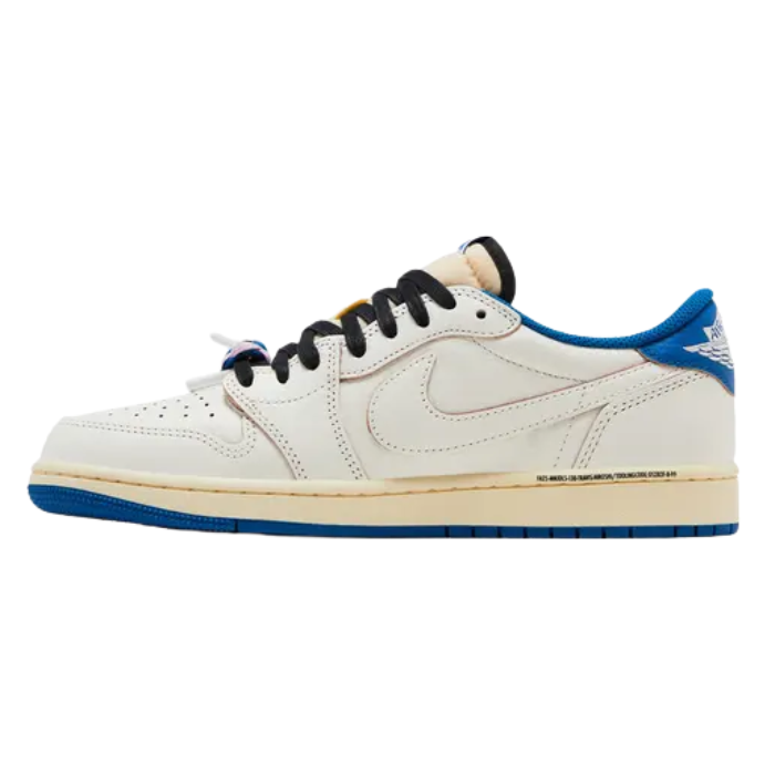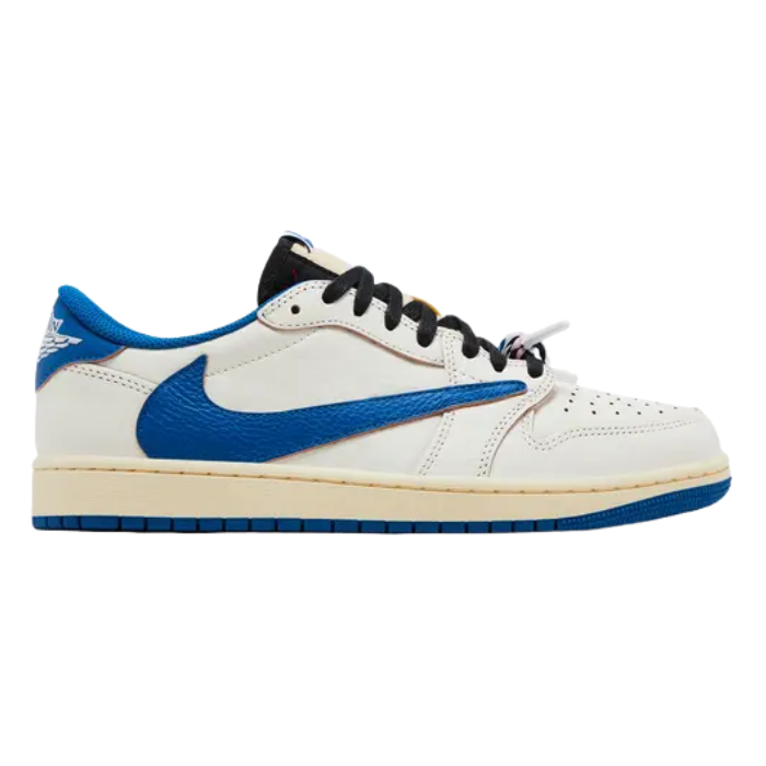 The Nike Air Jordan 1 Retro Low OG Fragment x Travis Scott Sail Military Blue (2025) combines classic style with modern flair. Featuring a smooth sail white leather base, it is accented with military blue overlays and an embossed reverse Swoosh—a signature Travis Scott detail. The black laces and cream midsole complement the design, while Fragment’s double-bolt logo adorns the heel. The co-branded tongue and pink insole add exclusive touches to this highly anticipated collaboration, balancing heritage, innovation, and streetwear edge flawlessly.
