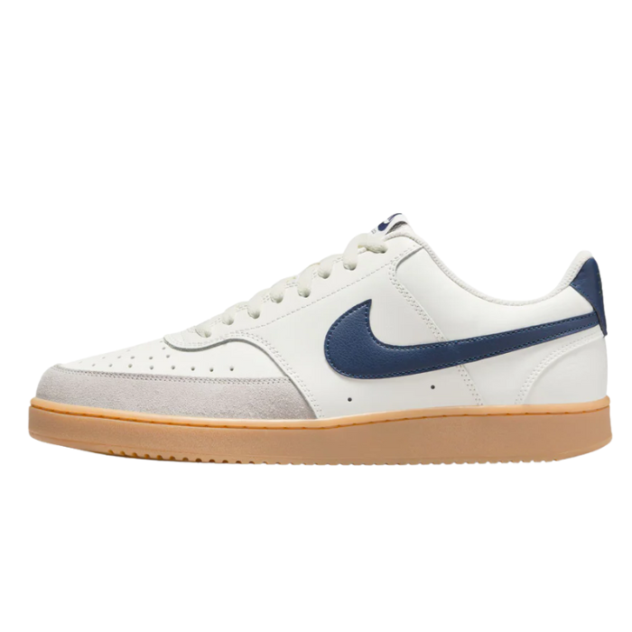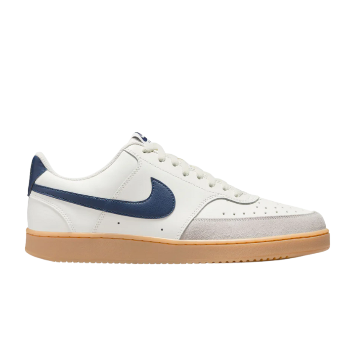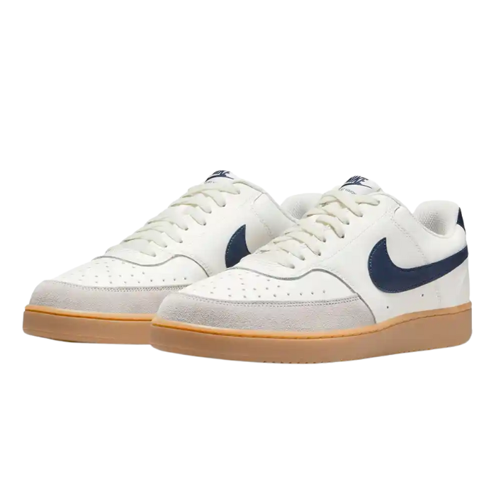 The Nike Court Vision Low "Cream" vintage '80s basketball style with a smooth cream synthetic leather upper, crisp stitched overlays, and perforated toe box for breathability. Features include a low-cut padded collar, retro Swoosh, thick laces, and durable rubber cupsole, delivering comfortable, clean-lined, and timeless everyday appeal.
