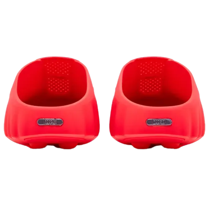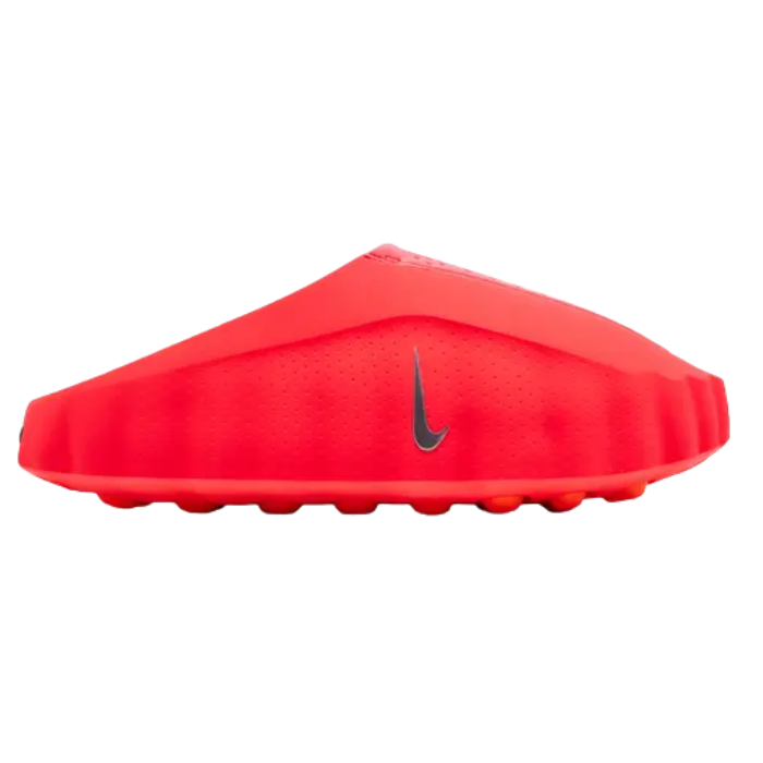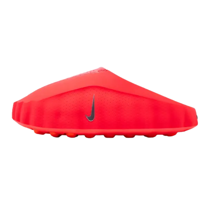 The Nike Mind 001 Mule 'Solar Red' revolutionizes pregame footwear with 22 articulated nodes on the outsole that stimulate foot sensory areas, enhancing focus and proprioception. Vibrant solar red foam upper pairs with hyper crimson accents and breathable perforated knit tongue for comfort. Soft midsole cushioning, stretch footbed, and rubber traction pods at toe/heel deliver lightweight recovery and grounding for athletic rituals