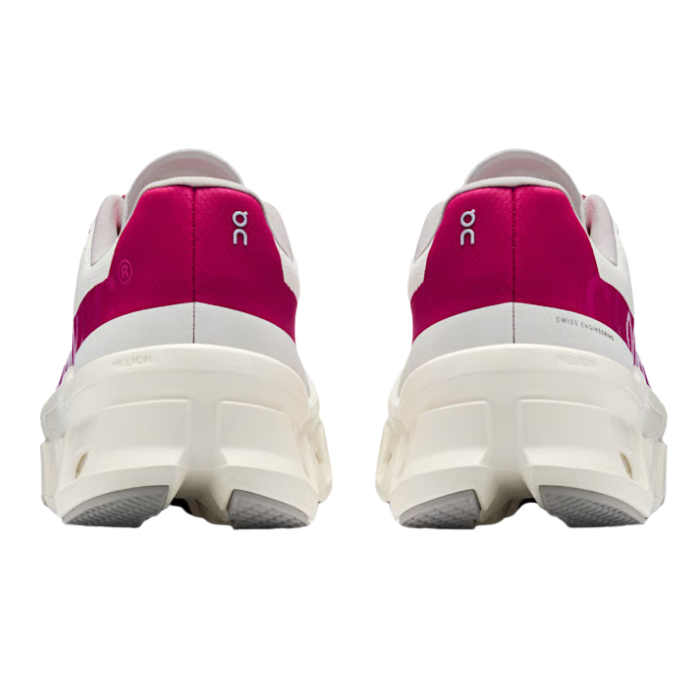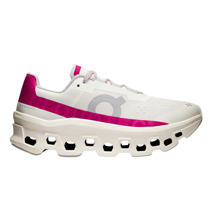 The On Running Cloudmonster in Ivory Grenadine delivers maximum cushioning with monster-level bounce for dynamic road runs. Creamy ivory engineered mesh upper with grenadine pink accents offers breathability and soft sockliner comfort. Helion™ superfoam absorbs impact, while snappy Speedboard® and bold rocker geometry propel forward momentum. Big ensure plush landings and energetic takeoffs through versatile daily training.