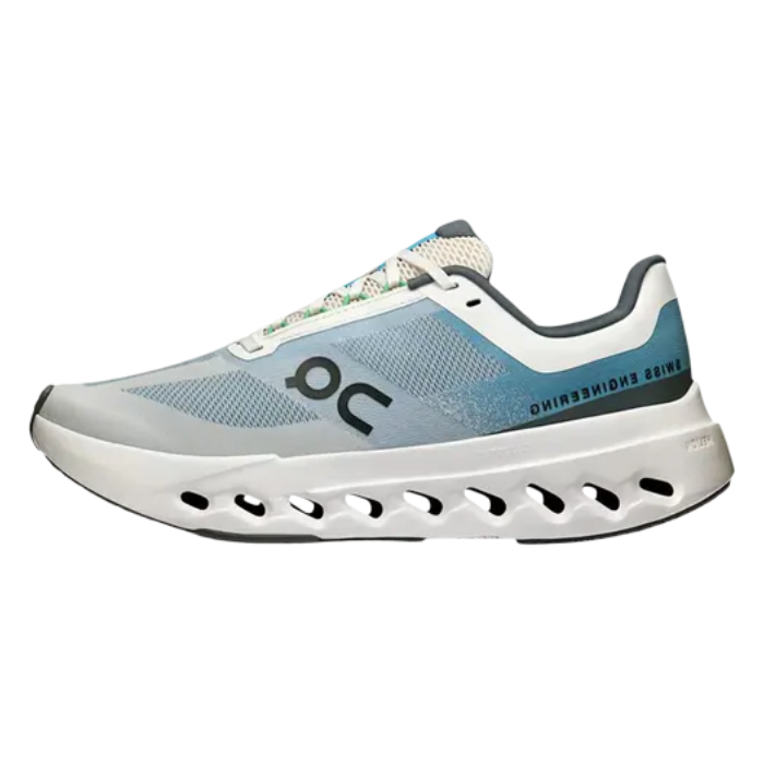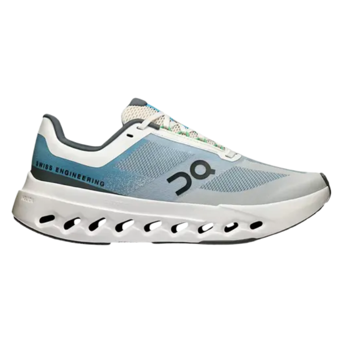 The On Running Cloudsurfer Next 'Niagara White' delivers responsive daily training with CloudTec Phase™ cushioning for seamless heel-to-toe transitions. Niagara blue and crisp white engineered woven upper provides breathable, race-day-inspired lockdown. Helion™ superfoam midsole ensures bouncy energy return, while agile forefoot rocker and rubber outsole pads enhance propulsion, grip, and durability at just 225g with 6mm drop