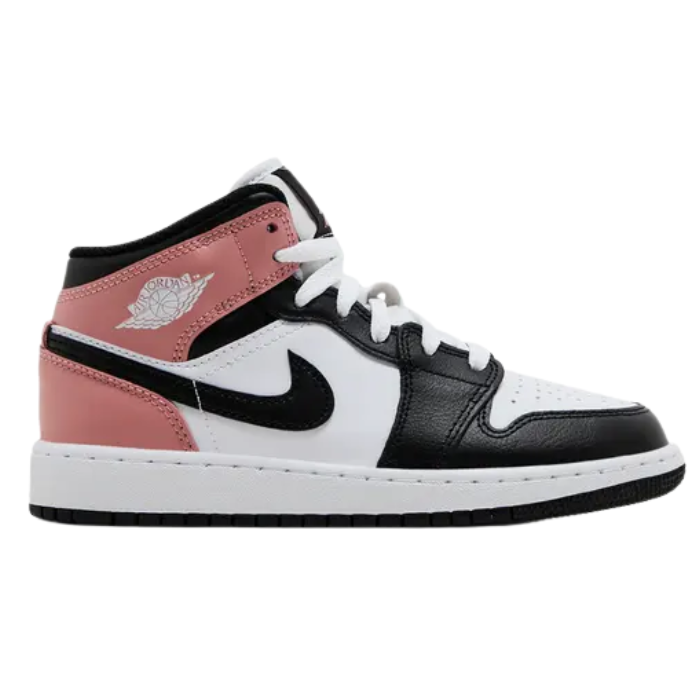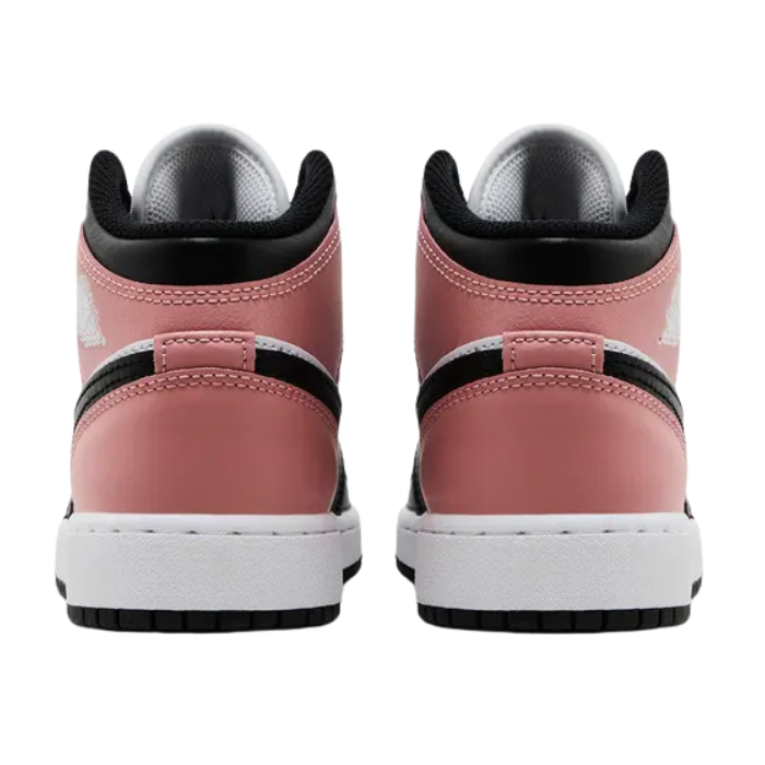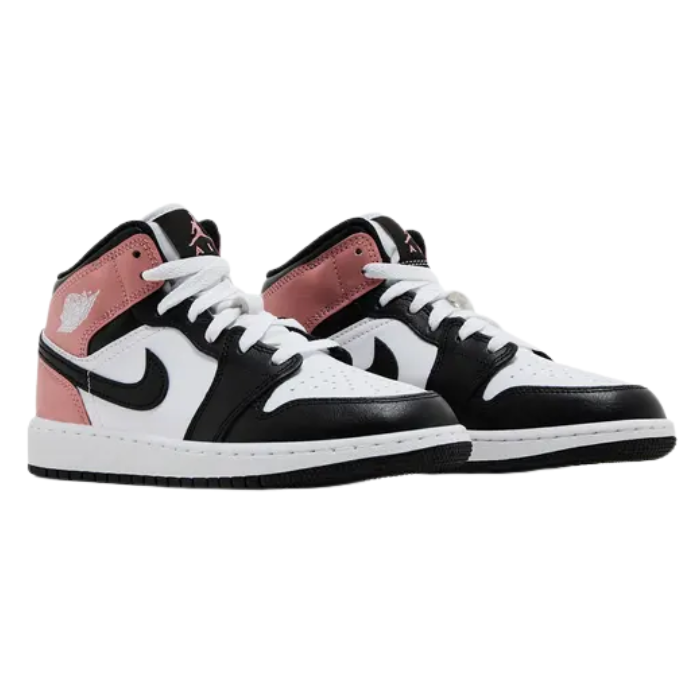 Air Jordan 1 Mid GS 'Rust Pink' features a mid-top design inspired by the original AJ1 silhouette, with a striking color palette of white, rust pink, and black. It uses premium leather and synthetic materials for a supportive fit, while a white midsole contrasts sharply against a black outsole. Equipped with Nike Air cushioning and a padded collar, it offers both comfort and iconic style, perfect for youth wearing and casual streetwear.